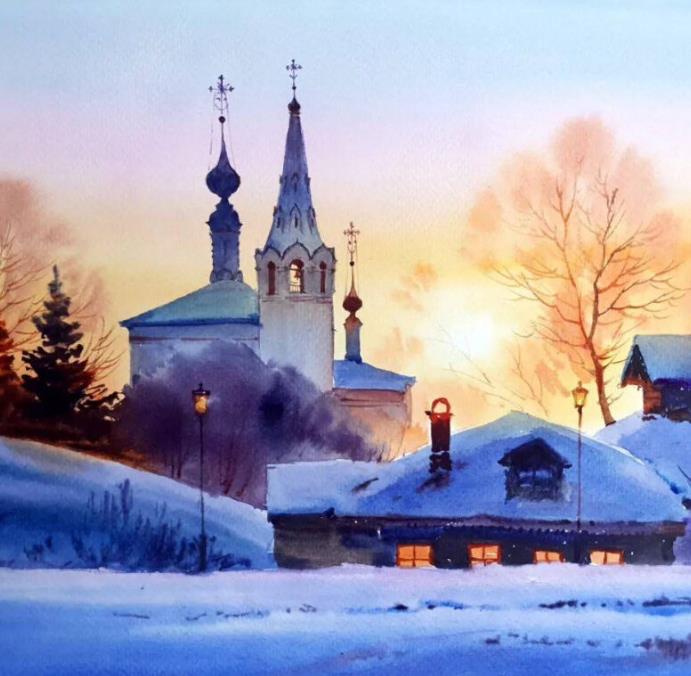 Как с помощью акварели «запустить» солнечный свет из плоскости картины на зрителя? В первой части урока обсудим материалы и сделаем несколько упражнений по рисованию яркого света в темное время суток. Выполним заливку по-сырому солнечного ореола и разберем его в цвете. Научимся изображать свет фонарей на темном фоне и потренируемся не бояться набирать темный тон фона. Разберемся, как с помощью акварели зажигать свет в окнах домов.