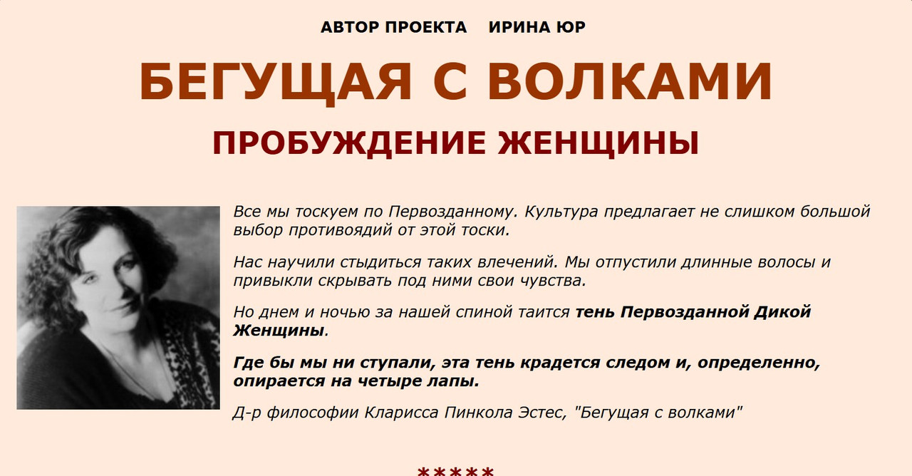 А в этом блоке я приглашаю Вас соединиться со своей Дикой Женской Душой, откликнуться на ее зов, познакомиться с Хранительницей Первозданной Женственности и победить Внутреннего Хищника.